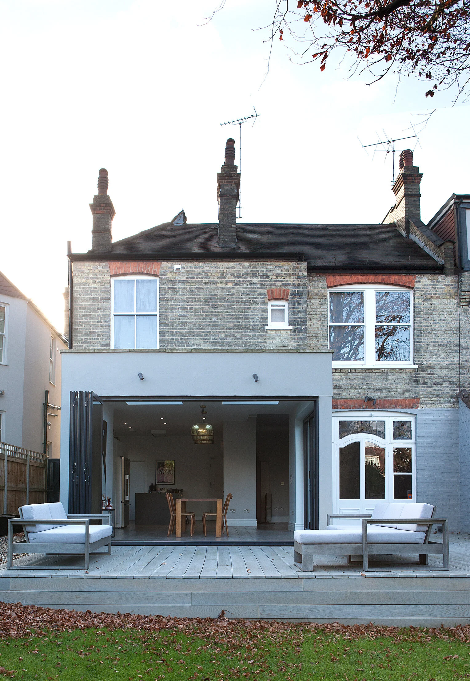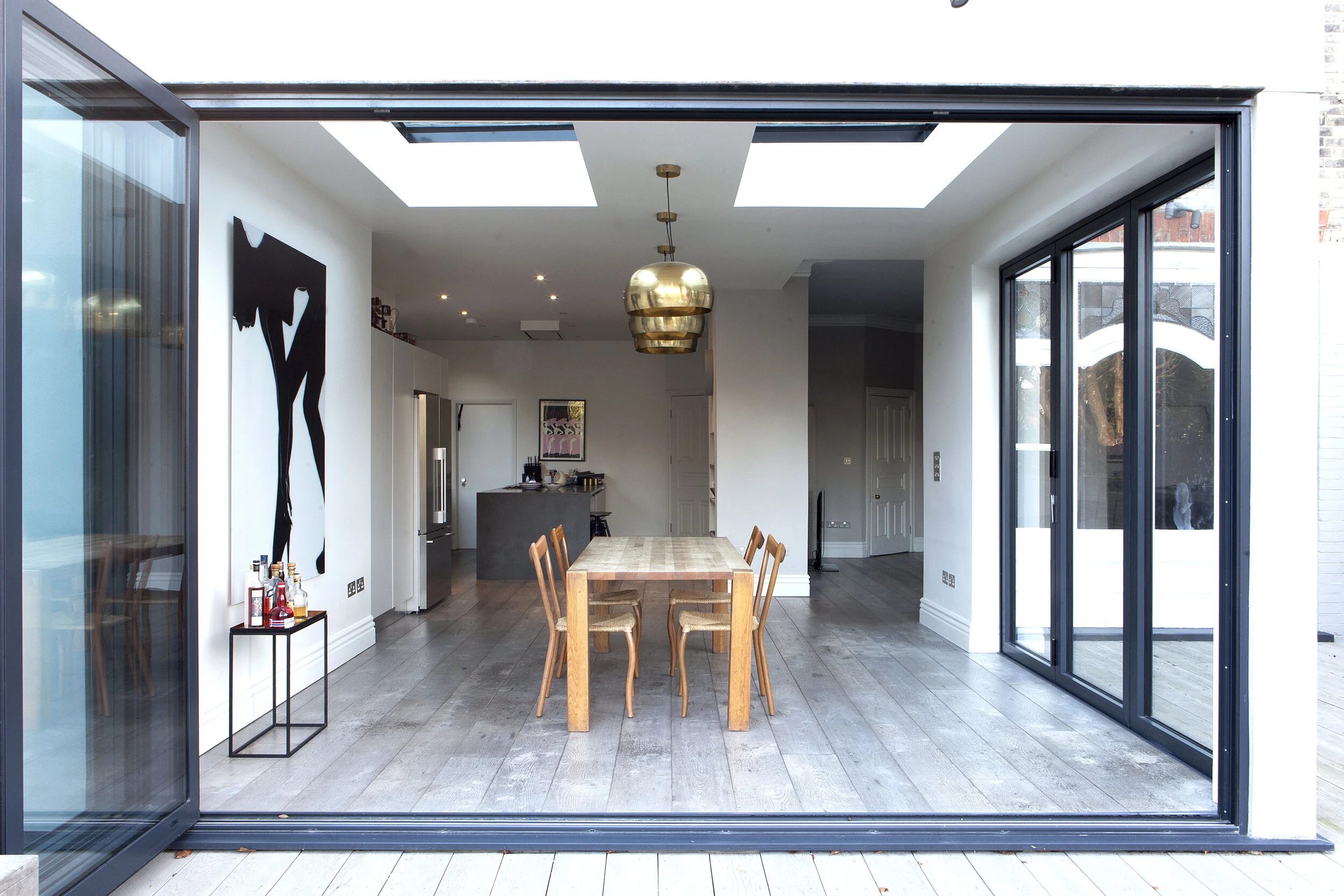 Bold artwork, brass lighting, and oak flooring combine in this light-filled extension to a Victorian house in North London. Once the large doors are opened the internal wooden floor finish is matched by external decking giving a true sense of inside/outside space. Overall the feel is urbane, refined and luxurious...perfect for a couple whose sons are flying the nest.